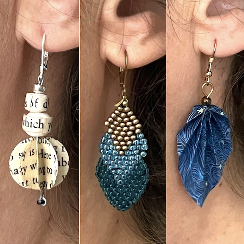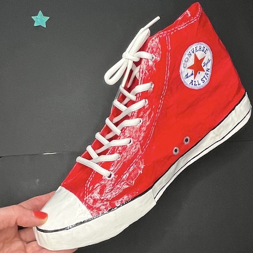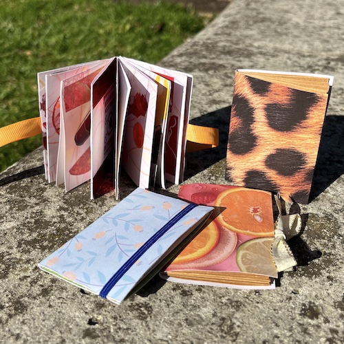 Vous pouvez voir des exemples de réalisations sur mon compte Instagram ou sur ma page Facebook. Vous y trouverez des carnets reliés ici et là, des broches et des boucles d’oreille, la Converse en papier mâché, un tote bag personnalisé…
